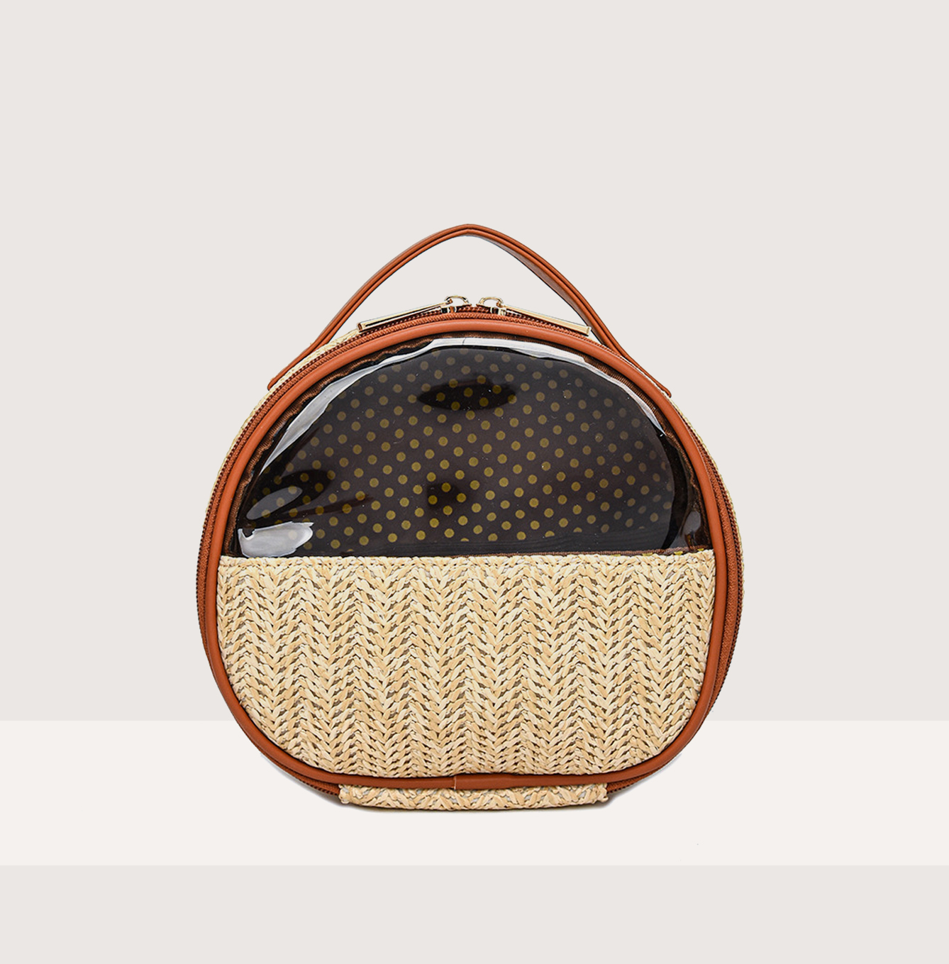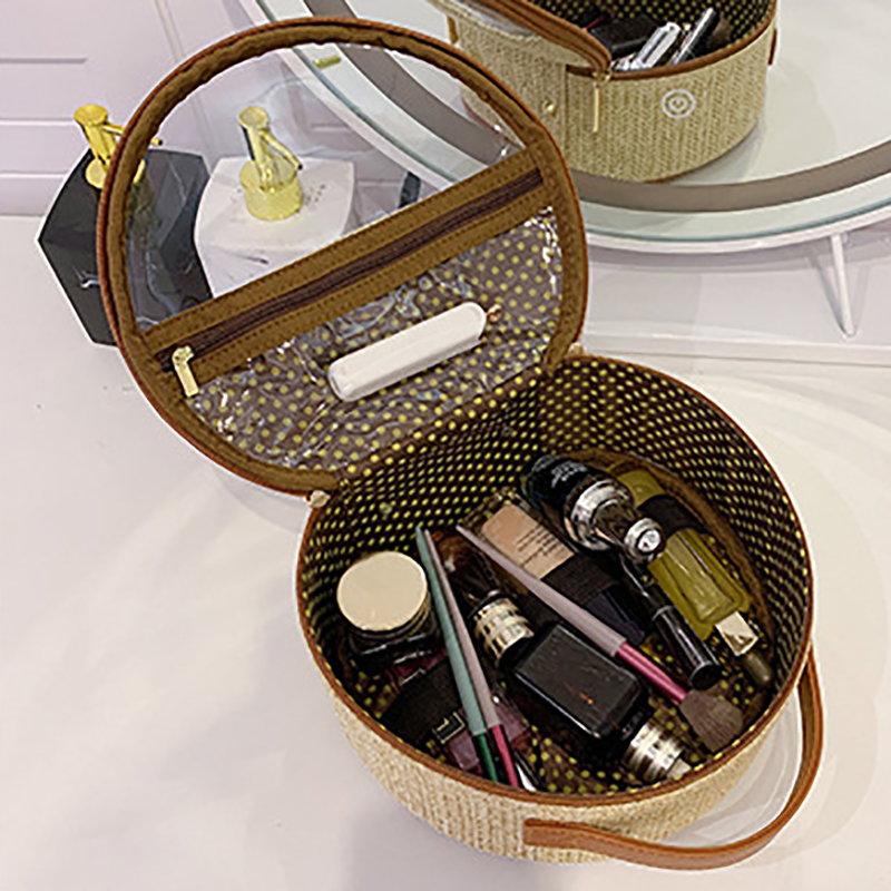 Fabric Features: Crafted from high-grade natural straw (wheat straw, rattan straw, or seagrass—all renewable, biodegradable materials), it addresses top user FAQs with core benefits: ① eco-friendly & sustainable (aligns with “zero-waste beauty” and “natural packaging” search trends, appealing to green-conscious clients); ② durable yet lightweight (reinforced weaving resists fraying, while the hollow straw structure keeps the bag light—perfect for beach trips or carry-on luggage); ③ breathable & moisture-resistant (straw’s natural gaps prevent moisture buildup, keeping powders/creams fresh, and surface wipes clean with a dry cloth—solving concerns about “straw maintenance”). The rustic texture also adds a vacation vibe, making it a top choice for “summer cosmetic storage” searches.